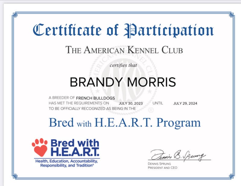 In October 2010, the UK French Bulldog Health Scheme was launched.The scheme consists of three levels: the first level, Bronze, designates a basic veterinary check which covers all the Kennel Club Breed Watch points of concern for the breed. The next level, Silver, requires a DNA test for hereditary cataracts, a simple cardiology test, and patella grading. The final level, Gold, requires a hip score and a spine evaluation. The European and UK French Bulldog fanciers and Kennel Clubs are moving away from the screw, cork screw or 'tight' tail (which is an inbreed spinal defect), and returning to the short drop tail which the breed originally had. The UK breed standard requires that the tail be "undocked, set low, thick at root, tapering quickly towards tip, preferably straight, and long enough to cover anus" and "never curling over back nor carried gaily".